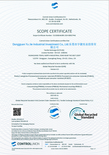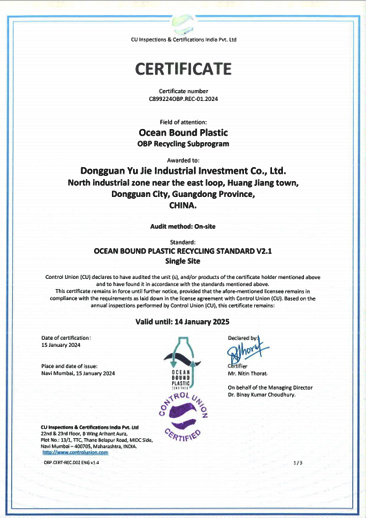 Yujie industrial has successively passed various professional international system certifications, including ISO9001, ISO14001, IATF16949, GRS, UL2809, ISCC and OBP marine recycling.